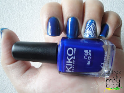 O 335 eu esqueci de fotografar antes de ter carimbado o anelar, mas da pra ver nas outras unhas a cor. É um azulão tipo caneta bic, super chato de pintar e de limpar. É meio transparente quando colocado contra a luz. Mas a cor é LINDA, eu usaria muito mais vezes se ele fosse mais prático de esmaltar e limpar os cantinhos.