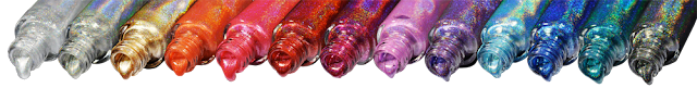 São 12 esmaltes holográficos. E vocês lembram da receitinha de top coat holográfico que a Naty postou aqui? Eles também estão lançando uma cobertura holográfica!