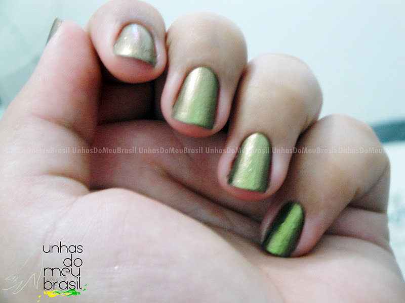 Ele é um esmalte de acabamento metálico e quase fosco na minha opinião. A sua cor varia de verde musgo para dourado, passando por marrom.