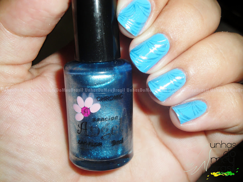 Decidi então carimbar com um liiiindo esmalte, o Zak Flor, da Sancion Angel..um azul forte, cromado, arrasoo! Usei a estampa de ondinhas da plaquinha m69, da Konad.